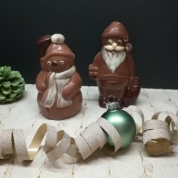 Les Pères Noël et Bonhommes de neige sont en chocolat au lait. Ils décorés à la main avec du chocolat blanc et chocolat noir (fine couche).